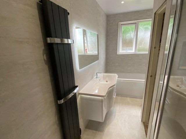 The large format Porcelanosa tiles really do transform the room along with the narrow 1mm grout lines. The LED mirror adds some ambient lighting to the room and the designer rad looks stylish whilst providing more than enough heat for the room. My own personal favourite is the the niche above the bath 🙂