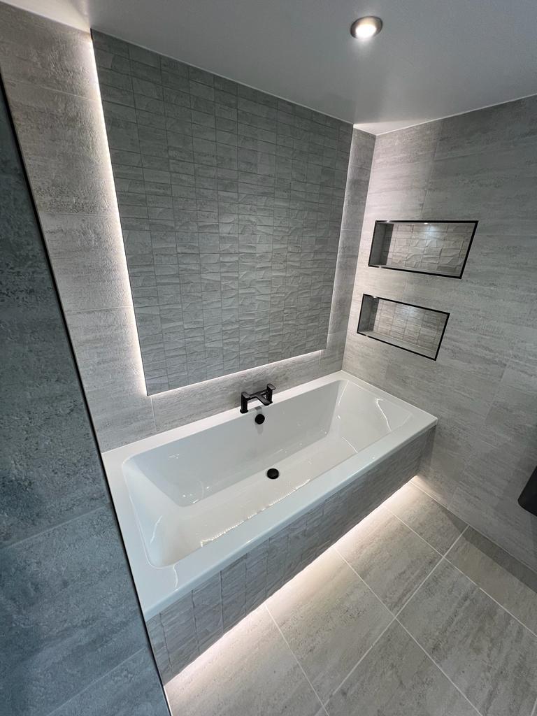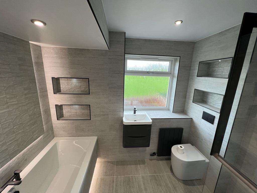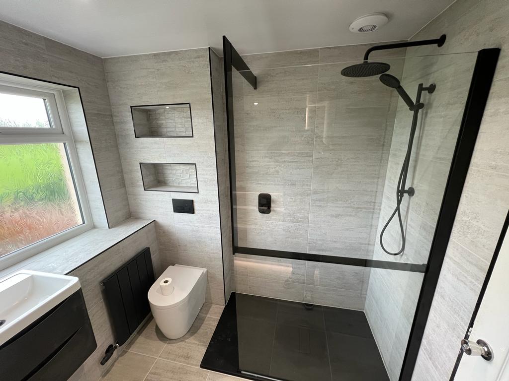 Where to start……. The inset bath, with tiled bath panel just and led lighting transforms your run of the mill bath into something exciting that you just want to jump into. The bespoke feature mirror with leds looks amazing above. The cistern is concealed along with some of our famous dookits. The floating vanity is built into the bulkhead to allow more space within the room. My personal favourite item being the designer shower screen with built in ledge. This looks very contemporary and also provides some shower storage. The black trim just takes this to the next level.