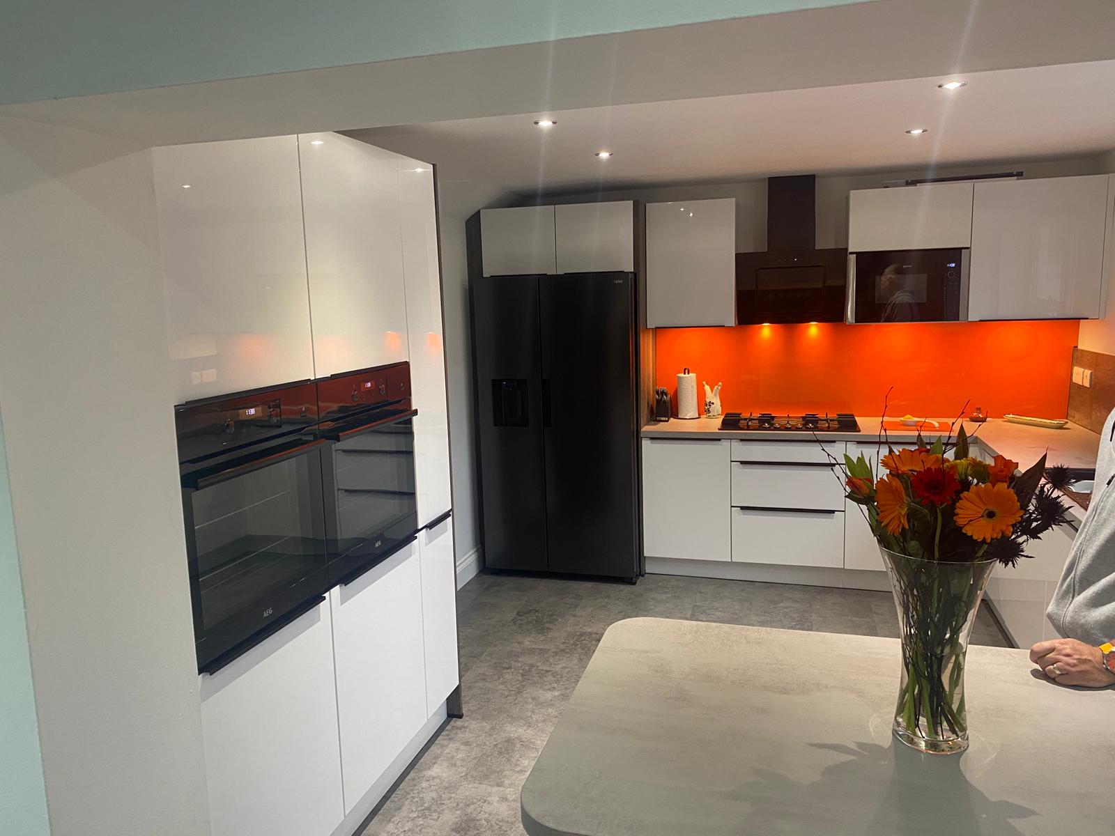 These stunning white gloss lacquered doors with black recessed handles look amazing. The Havanna Oak worktop and complimentary splashback add texture and depth. However the real showstopper is the vibrant orange glass backsplash, wow what an effect. Concrete style flooring and stone anthracite sink and kettle tap complete the design.